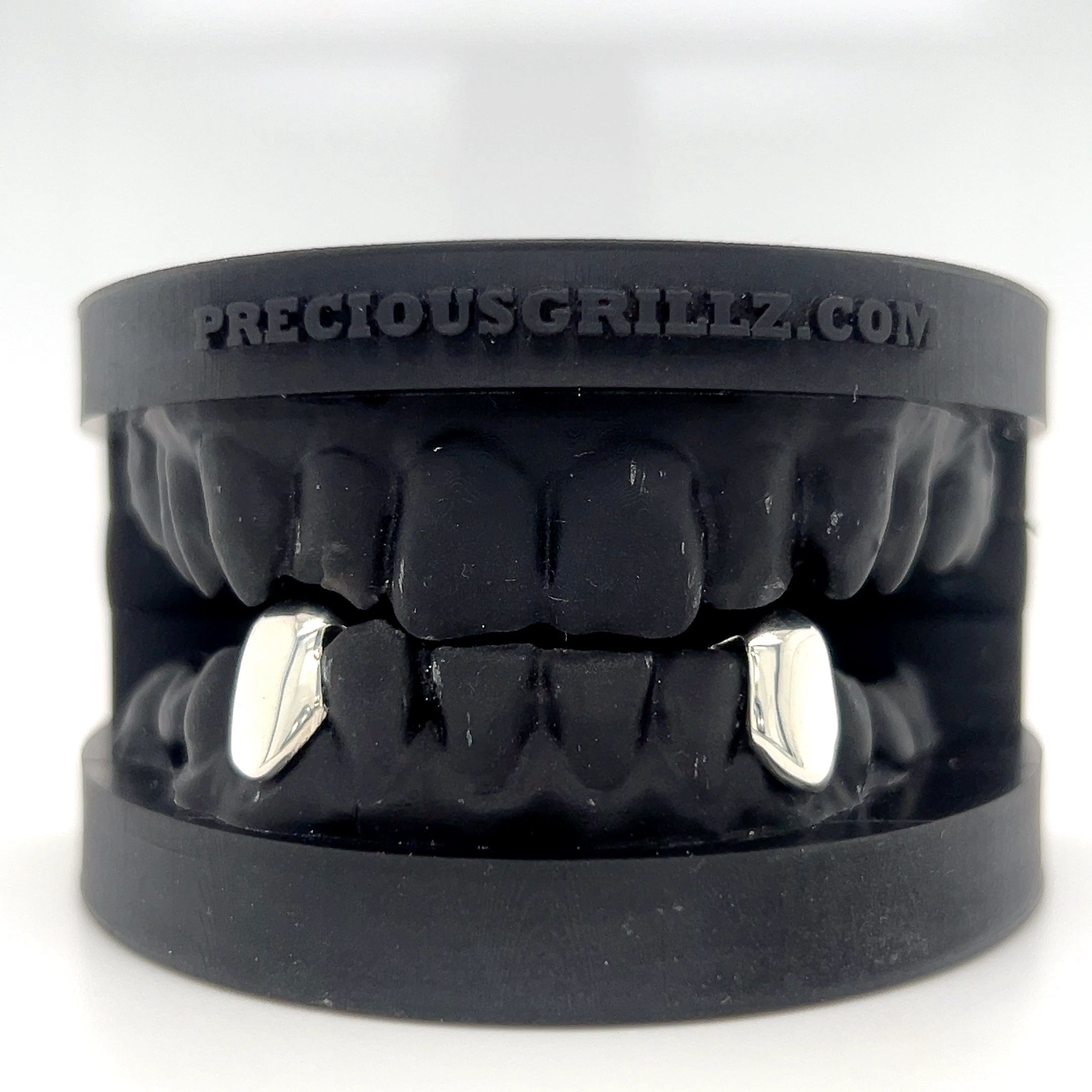 14k solid gold custom K9 fangs set. · You get 2 top and 2 bottom canines. · Fangs are pointy vampire teeth. · Includes hidden connecting back bar. · 100% handmade